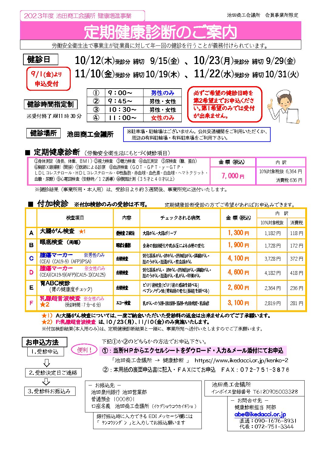 「定期健康診断」のご案内 毎年多くの会員事業所さまにご利用いただいている「定期健康診断」ですが、秋の健診日程が決まりましたのでご案内いたします。従業員の健康管理に!福利厚生の充実に!モチベ―チョンアップに!ぜひお役立て下さい。
