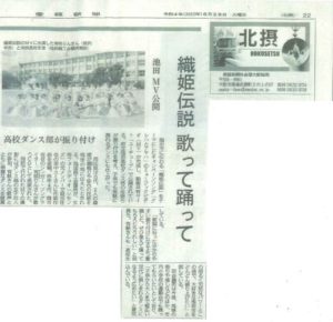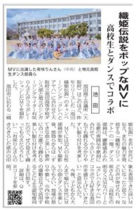 池田商工会議所では「織姫プロジェクト」の一環として「池田織姫伝説」キャンペーンソング「クレハとアヤハ」に合わせて、大阪府立池田高等学校ダンス部と地元シンガーソングライター有咲りんさんとのコラボレーションによるMV(music video)が産経新聞朝刊(6月28日発行)、日本商工会議所 会議所ニュース(7月11日発行)に取り上げられました。