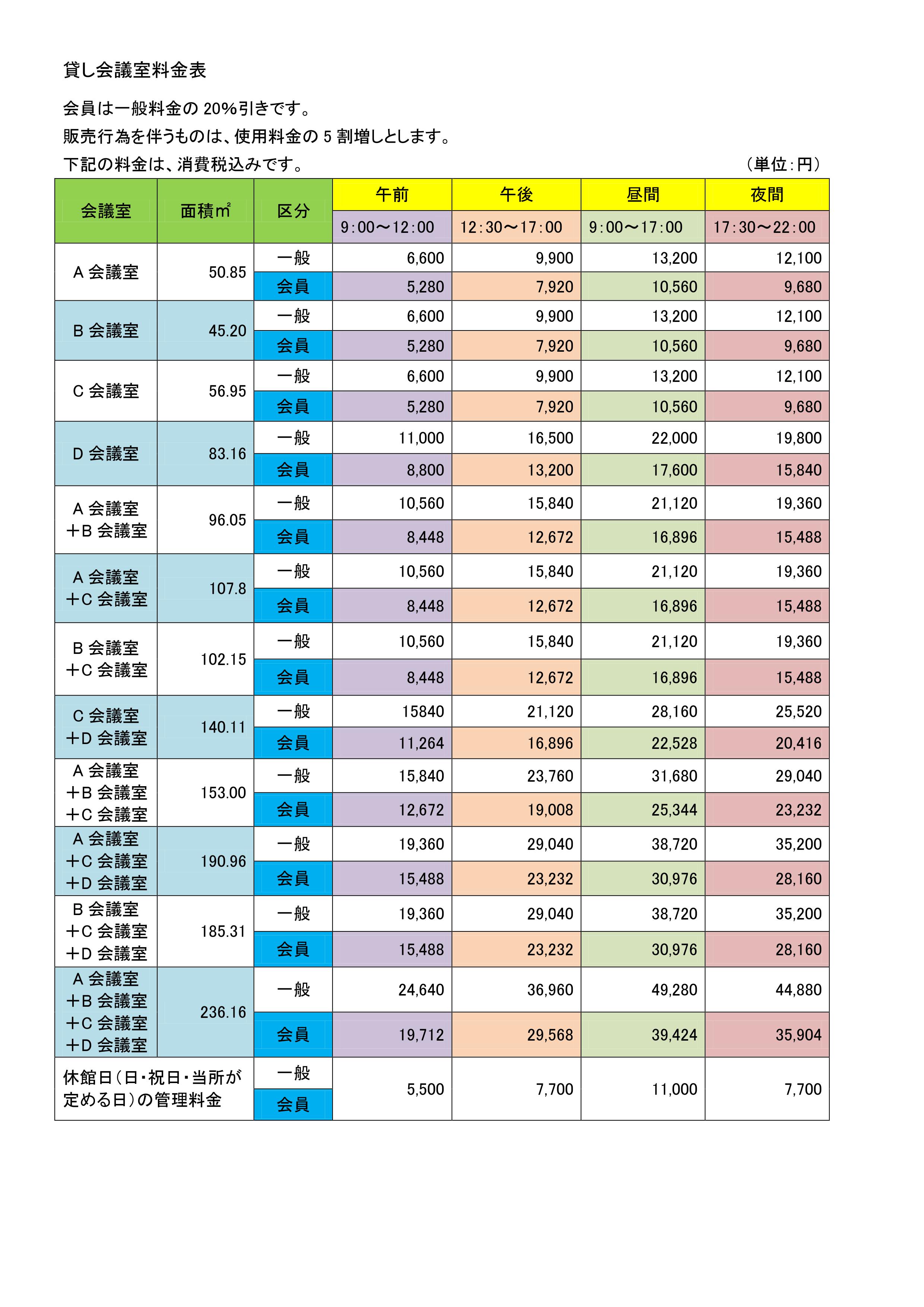 2019年10月1日以降の予約に係る貸会議室・備品等の料金(消費税10%による)のご案内