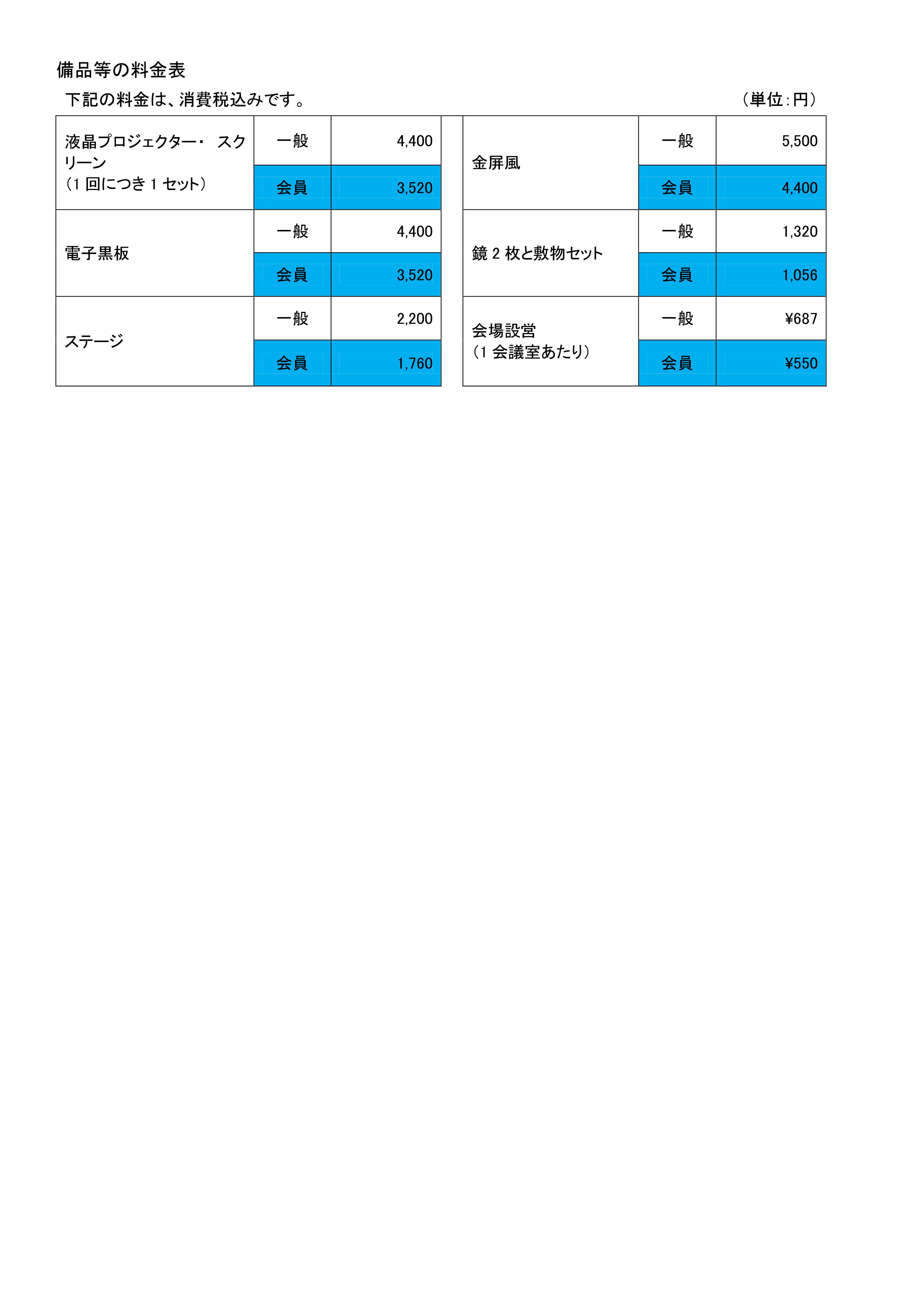 現在、当所ホームページでは貸会議室・備品等の料金について消費税8%の金額でご案内させていただいておりますが、2019年10月1日以降の貸会議室・備品等の利用予約について、消費税増税に伴い、消費税10%を加算した料金表にてご請求をさせていただきますのでご了承ください。