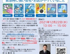 自然災害や感染症の影響で今、BCP(事業継続計画)がアツイです!人命を助けるのは防災計画ですが、会社を助けるのはBCP(事業継続計画)です!いつ発生してもおかしないと言れている『南海トラフ地震』や様々な災害に備えましょう!1.開催日時 2021年12月22日(水)13:00~...