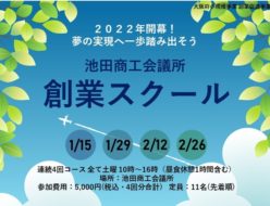 池田商工会議所では、創業準備中・創業間もない方向けに、それぞれのテーマに沿った専門家が創業に必要な知識をレクチャーする「創業スクール」を開校します。参加者同士のディスカッションや交流タイムも充実!年に1度の参加のチャンスです。