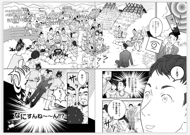 就活中の健太は、染殿井(大阪府池田市)で足を滑らせた拍子に古代へタイムスリップしてしまいます。状況がつかめないまま古代人に取り押さえられ、牢屋へ直行。いきなりの大ピンチ!